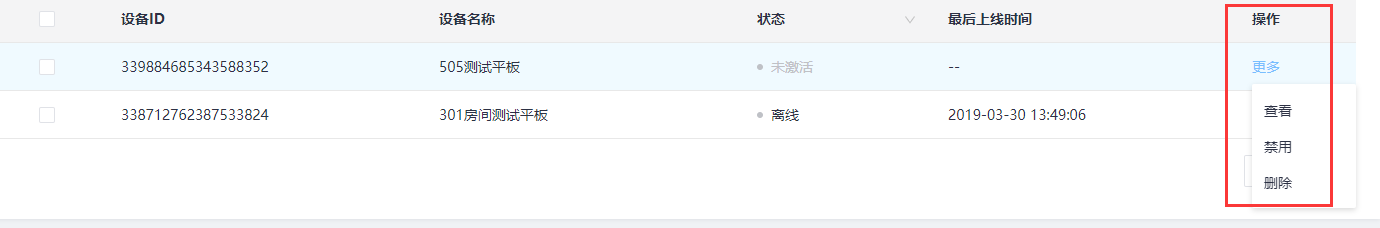 操作:包括查看、禁用及删除设备。查看设备见2.2设备详情,禁用及删除设备同上面批量禁用、删除所选,区别为这里只是针对单个