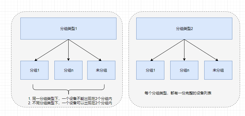 - 同一个设备,可以加入不同分组类型下的多个分组。如分组类型GroupTypeA下面有A1、A2两个分组,分组类型GroupTypeB下面有B1、B2两个分组,设备DeviceA可以加入A1(或A2)和B1(或B2)两个分组。